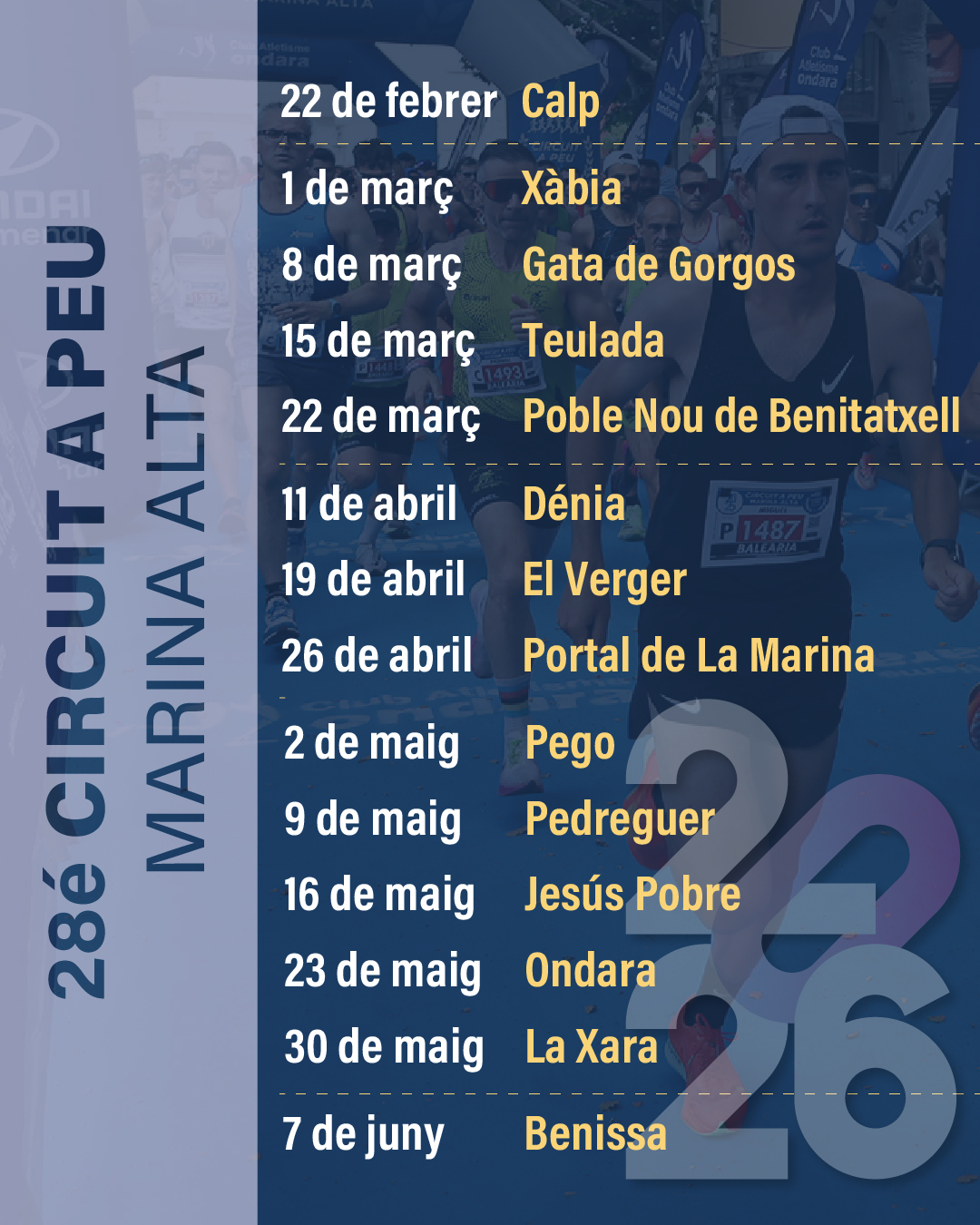 Les 13 curses que formen el Circuit a Peu Marina Alta es realitzen en les següents poblacions, amb el suport de Clubs esportius locals i dels Ajuntaments de: Xàbia, Calp, Gata de Gorgos, Teulada, Poble Nou de Benitatxell, El Verger, C.C: Portal de la Marina, Dénia, Pego, Pedreguer, Jesus Pobre Ondara, i Benissa.