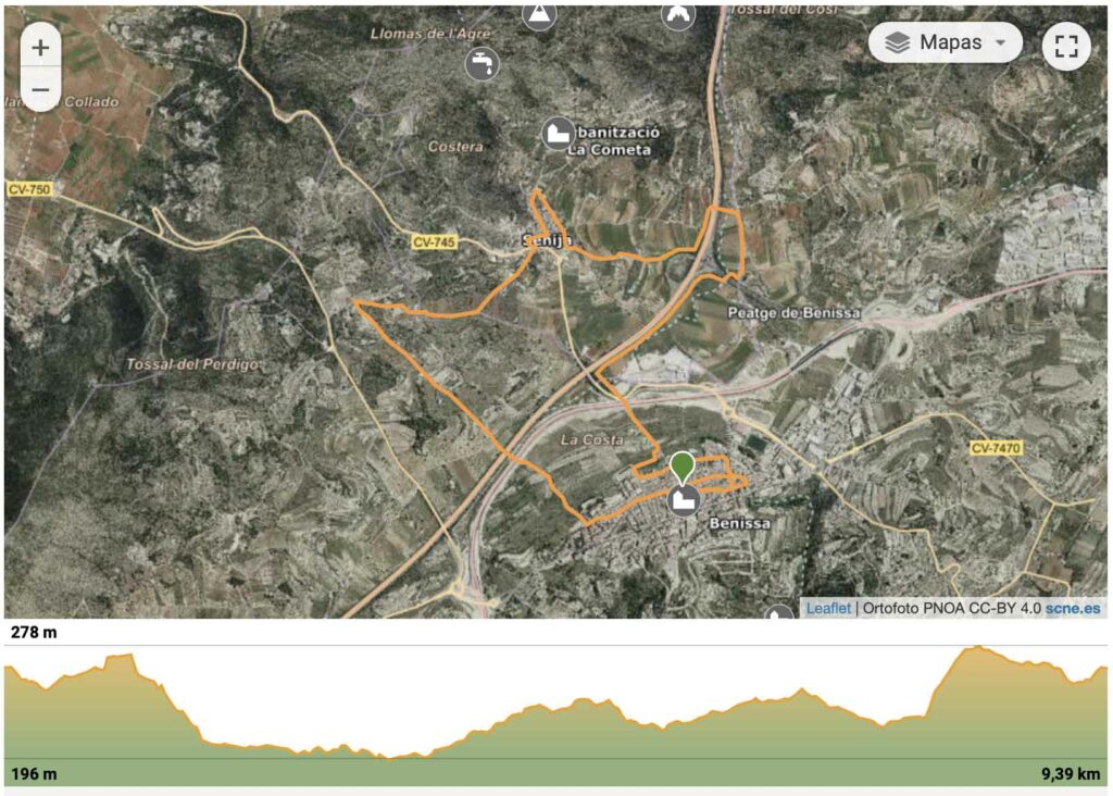 La prueba reina prevista para las 19:00 horas, completara una distancia de 9 ́4 kilómetros con salida y llegada en el mismo lugar que las carreras de los niños y niñas, una carrera con un recorrido atractivo que discurre por las calles de Benissa en su parte más urbana, alejándose hacia la localidad de Senija, en el kilómetro 5 donde está situado el avituallamiento, para volver hacia Benissa por el Collao unos dos mil metros para dirigirse hacia la zona más complicada por la subida conocida como Colorins en el kilómetro 8, donde una vez superada entramos de nuevo por la zona norte a Benissa para recorrer los últimos metros hacia la meta, donde la organización a preparado un último avituallamiento para los finisher.