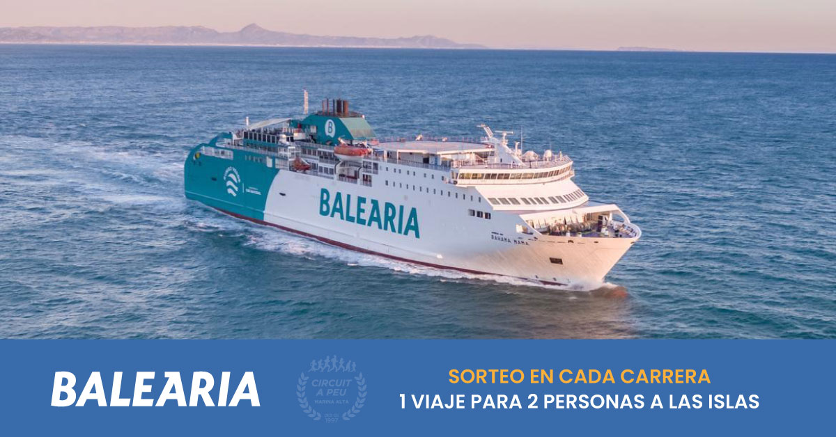 Balearia nos obsequia con un sorteo entre los participantes de cada carrera. Sorteo de un billete gratuito para dos personas, para cualquier destino de sus líneas, en acomodación Neptú, válido hasta diciembre 2024 (excepto temporada alta y puentes nacionales). En total son 13 billetes para 2 personas.