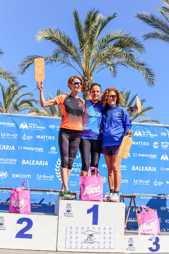 Els vencedors de la categoria Veterans F, Ana Melenchón Sánchez del CA Ondara, Louisa Ambler CA Corremundos i Clara Eugenia Palomares Gilo independent en xiques i José Antonio Amorós Pico CA Triatlo La Vila, Simón Danciger C Barnes Runner´s i l’independent Vicente González Pérez, es van emportar els lots de productes de neteja ASEVI.