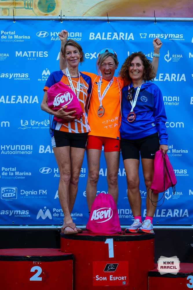 Els premiats amb els productes ASEVI, van recaure en la categoria Veterans F, tant en categoria masculina com femenina, en xics, Juan Carlos Fernández, del C Dénia, José Antonio Amorós CA Triatló La Vila i Rafa Sánchez, del CA Sense Pressa El Verger, en xiques Carmen Izquierdo del CA NexoTeam, Clara Eugenia Palomares, Independent i Lola Pérez del CA Benidorm.
