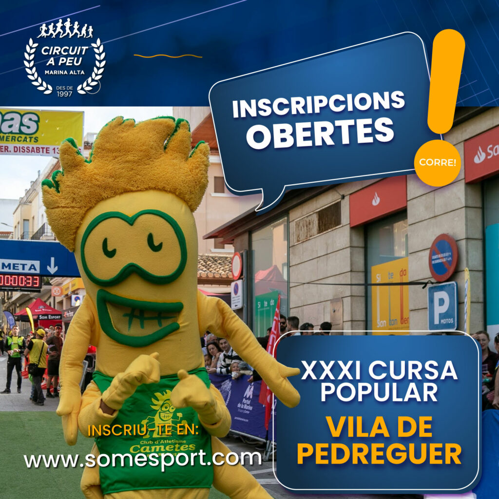 La 11ª prova puntuable, arriba este dissabte a Pedreguer, amb el seua XXXI CURSA POPULAR VILA DE PEDREGUER, les inscripcions per a participar en la prova per als corredors que no estiguen inscrits en el Circuit, estan ja obertes en les webs oficials del Circuit, www.somesport.com  i www.circuitapeu.com  fins a les dotze del migdia, d’este divendres 17 de maig, i no admetran més inscripcions el dia de la prova.
