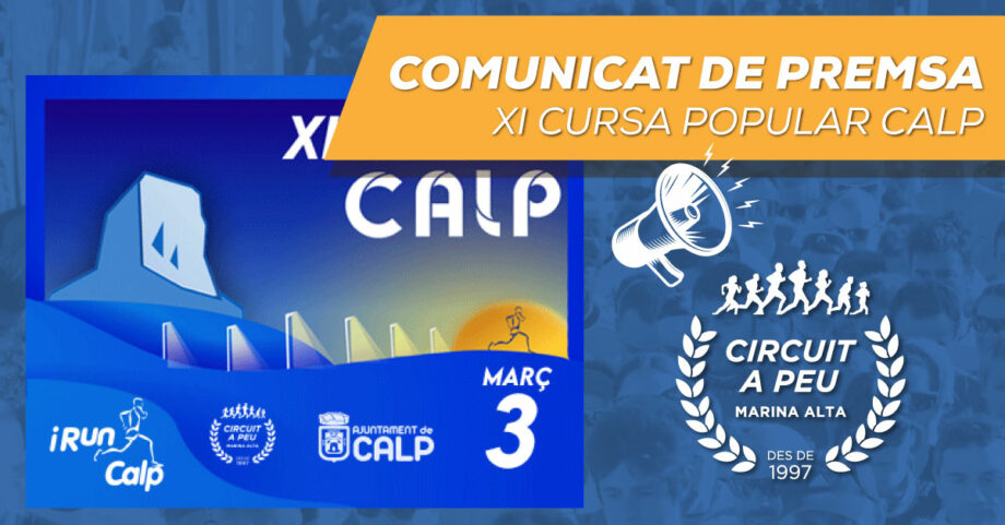 El Club d’Atletisme iRun Calp celebrarà la XI Cursa Popular Calp. La Cursa està organitzada pel club i compta amb la col·laboració de l’Ajuntaments del municipi del Penyal d´Ifach i patrocinadors, com a Aigües de Calp, Regidoria d´Esports i mymercat, així com Policia Local, Protecció Civil i molts voluntaris que contribuïxen en la seguretat del recorregut.